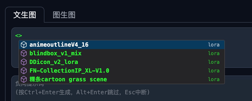 使用方式:在提示词框中输入 < 按提示选择 Lora 模型即可。